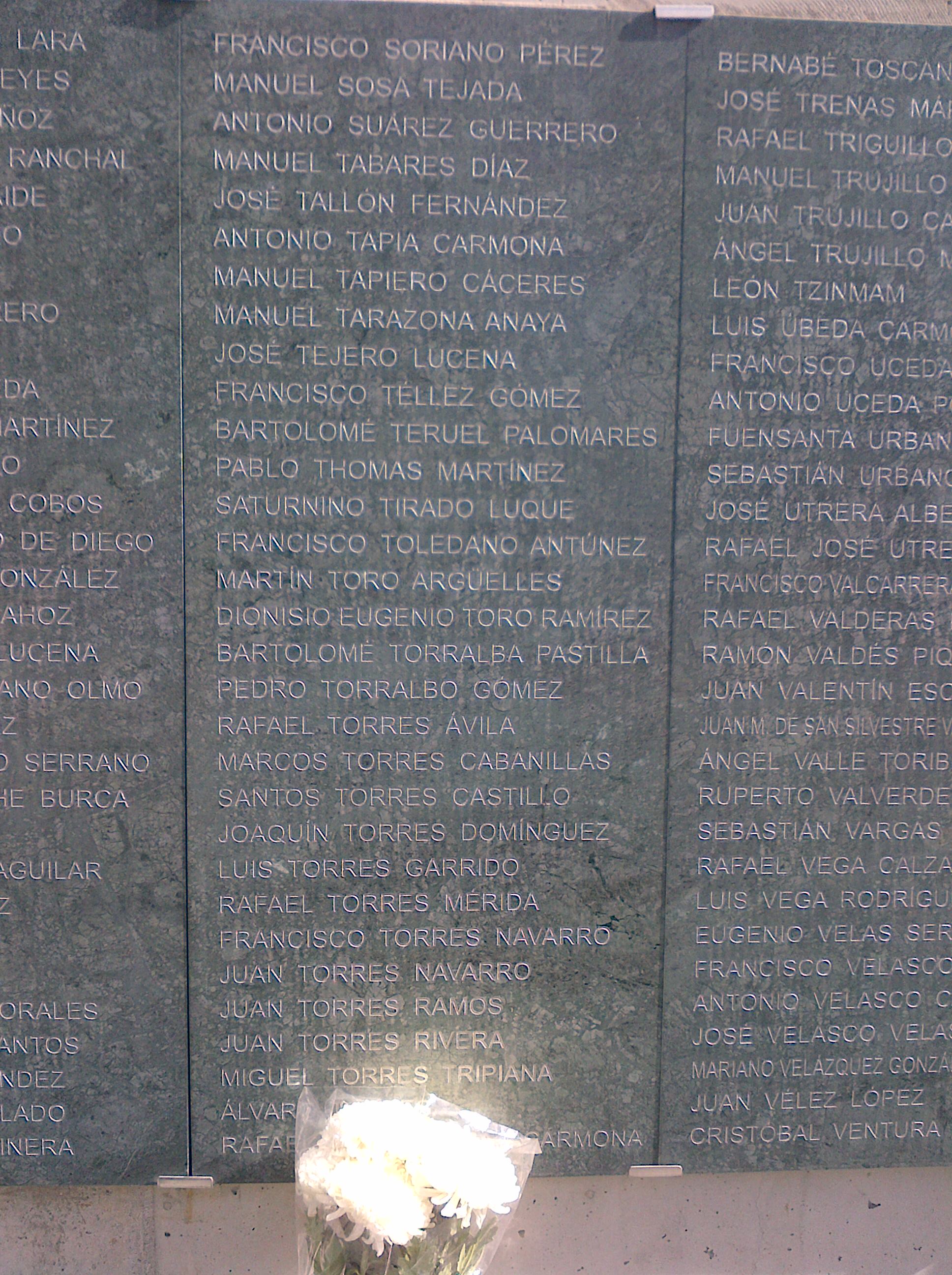 El nombre de Manuel Tarazona Anaya aparece (el octavo contando desde arriba) en el monolito en recuerdo de las víctimas de la represión franquista que se inauguró en el cementerio de San Rafael de Córdoba en el año 2011.