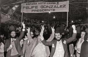 Manuel Gracia, Antonio Zurita, Cristóbal Mesa y José Miguel Salinas celebran el triunfo del PSOE el 28 de octubre de 1982. Los tres últimos aparecen en la lista negra de Córdoba (foto Ricardo, Diario Córdoba).