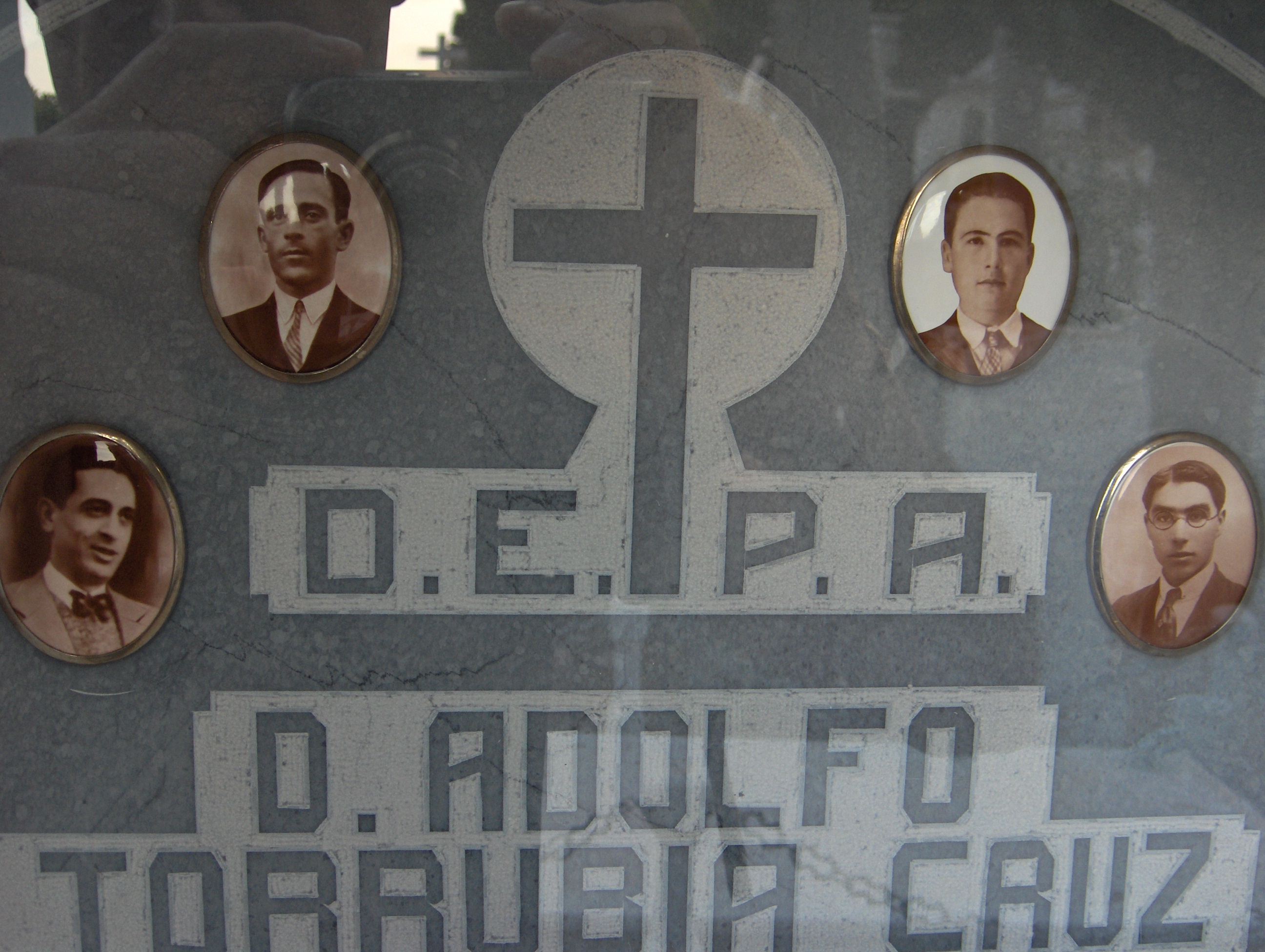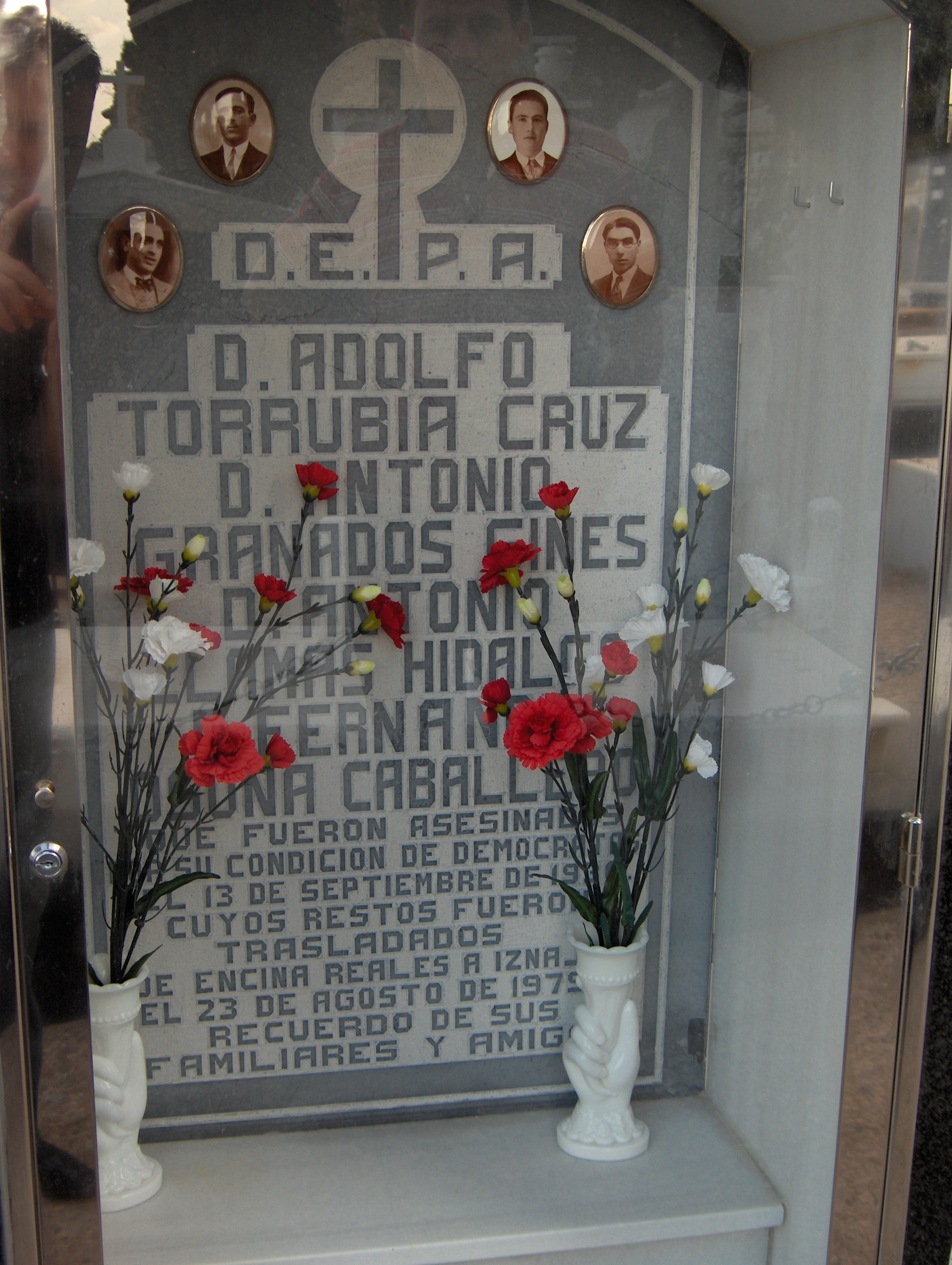 Fotografías en la lápida del cementerio de Iznájar de Adolfo Torrubia Cruz, Antonio Granados Ginés, Antonio Llamas Hidalgo y Fernando Osuna Caballero, fusilados el 13 de septiembre de 1936.
